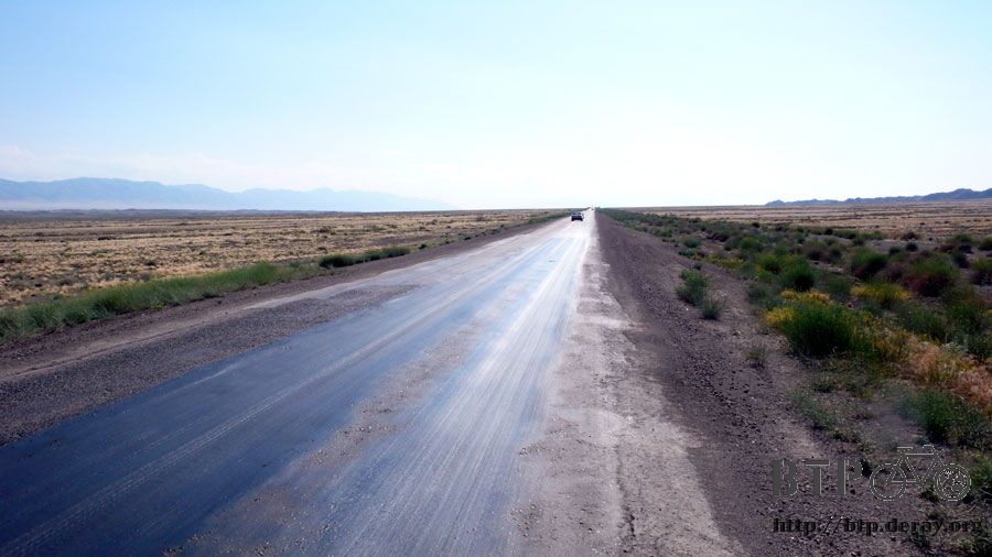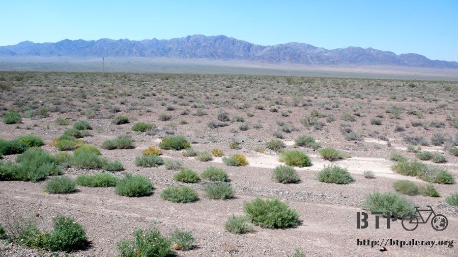 很希望有個樹蔭或是乘涼的地方,可是一整天下來連個加油站也沒看到,全部都是荒原,有時有點綠意、有時是光禿禿的地,但相同的都是沒有人跡。