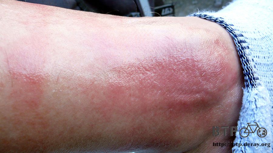 腳上本來穿著襪子的部分,有些紅腫,應該是騎車流汗的緣故,長褲將汗排到褲管的位置,然後就被襪子給吸走,接觸襪子的皮膚就過敏紅腫。