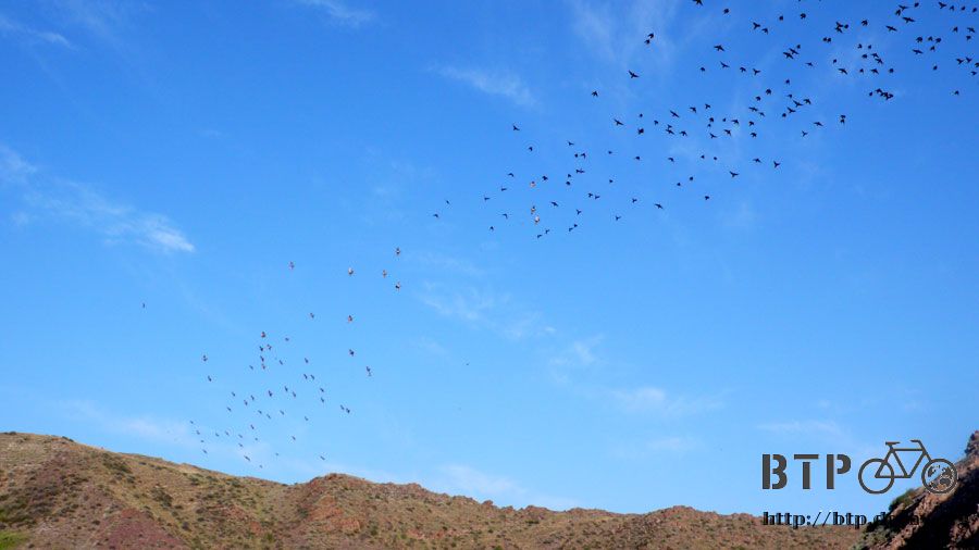 下坡這一段路很平順的前進著,呼吸著一大早的新鮮空氣,頭上的鳥兒整群的繞圈子飛行,好像在練習什麼一樣。