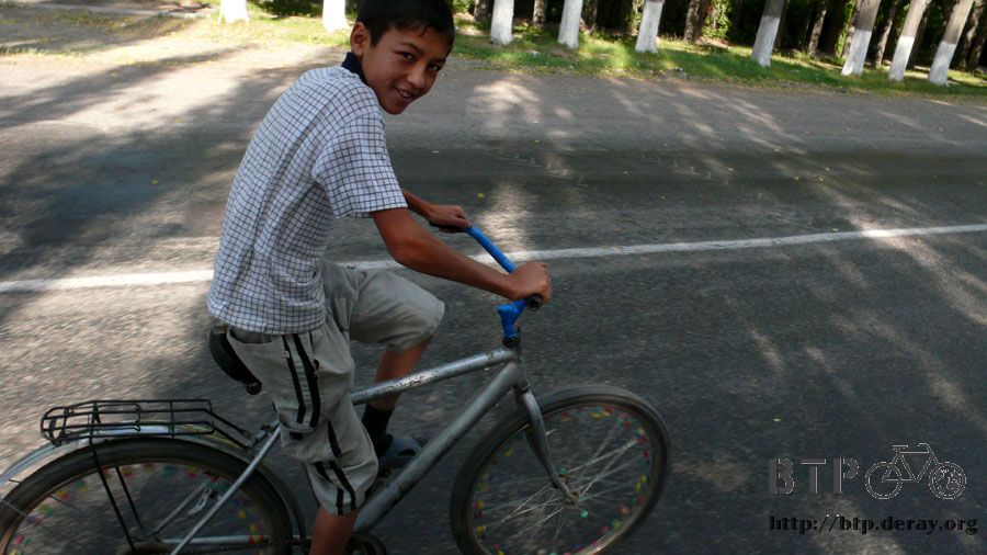 偶爾會有小鬼追著我騎車,哈薩克的自行車在輪胎部分都會裝飾很多彩色的塑膠片,這一台算是比較平淡的。