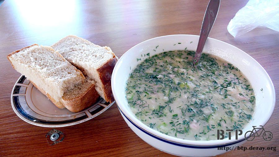 午餐是免費的,那個白色的湯是冰的,裡面有切碎的小黃瓜、熱狗等。湯上面飄著很多的綠色香料,味道我不是很喜歡,為了不失禮就勉強的吃。