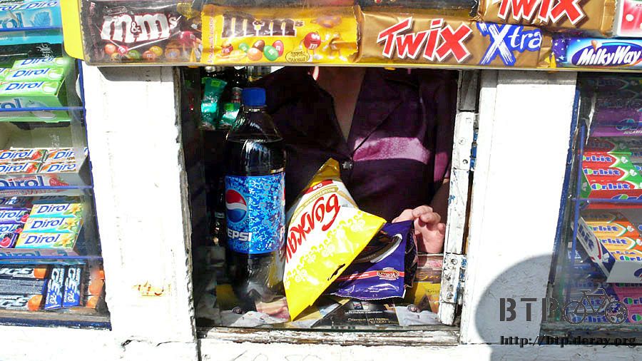 離開城市前在公車站牌旁的商店買了飲料、洋芋片和巧克力餅乾,然後就要跟大城市說掰掰了。
