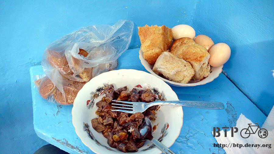 十分鐘後一個撐著雨傘、穿著雨鞋的人帶了簡單的食物,冷掉的燉羊雜燴、麵包和生雞蛋,配著早上買的餅乾。