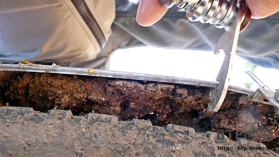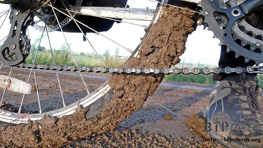 騎了一早上的車,原本附著在擋泥板上的泥巴乾硬了,剛剛又黏到新的泥巴,結果擋泥板和輪胎之間就全都是泥巴。