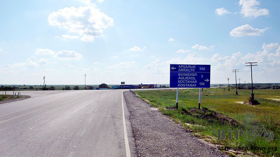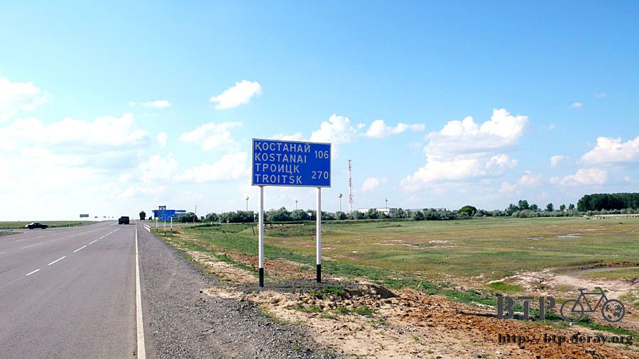 離開之後騎沒多遠,看到了新的告示牌,除了標示出我要去的科斯塔奈之外,連邊境城市也標出來了。