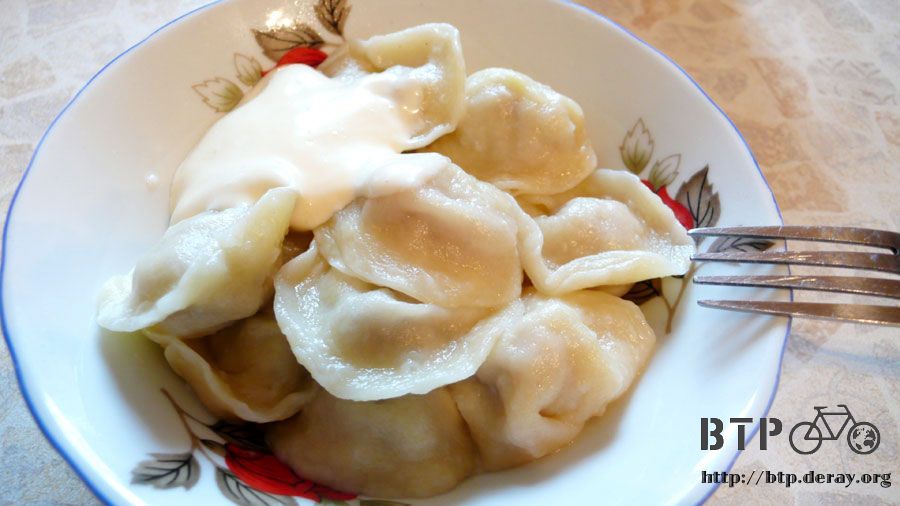 午餐就吃餃子,配上一大匙的奶酪,餃子有兩種口味,比較大顆的裡面包馬鈴薯(怎麼連吃水餃都逃不過馬鈴薯),小顆的則是包肉餡。