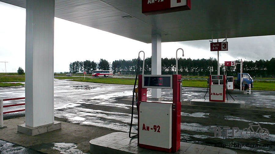 雨勢稍緩之後繼續騎車,若要等到雨停才走,可能得住在加油站才行。