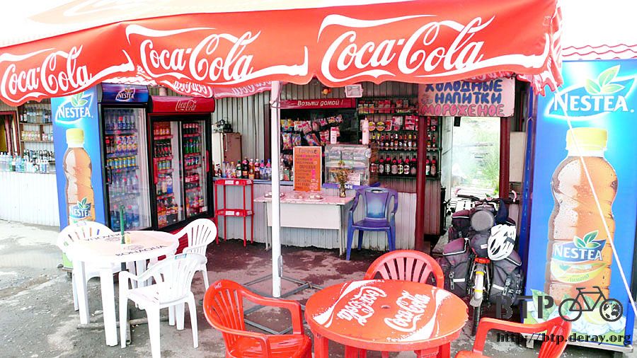 路旁正好是汽車休息區,小店搭起帳篷和冰箱並排著展開,空地則停滿了各式的車輛,大多是卡車。