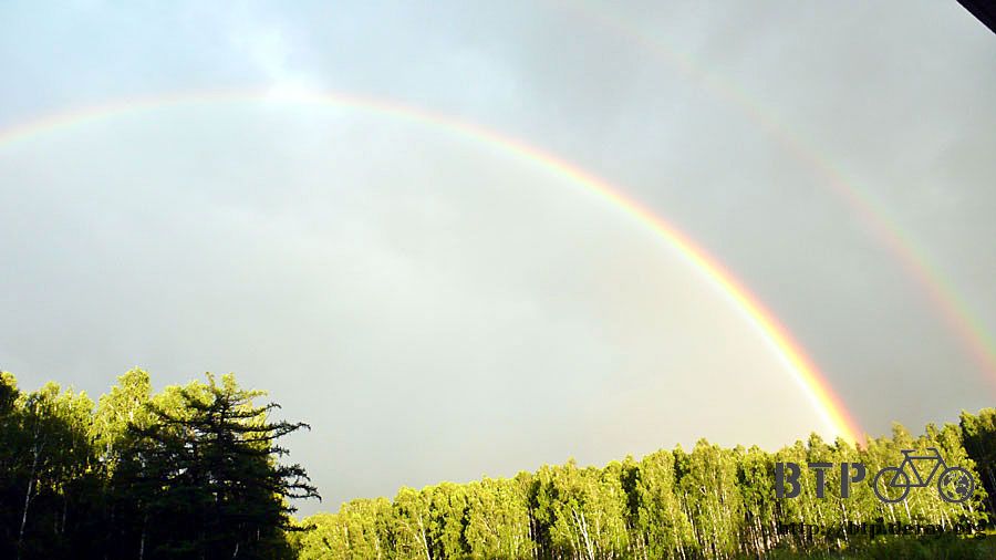 下過大雨後太陽露臉三分鐘,天空出現漂亮的雙彩虹,此景稍縱即逝,一眨眼太陽又消失在烏雲之中。
