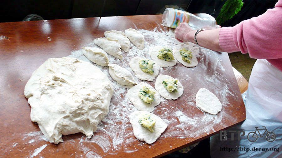 吃飽後,餐桌清空,看著店裡的婆婆揉麵團,擀麵皮,加上馬鈴薯泥,然後包成大水餃的形狀。