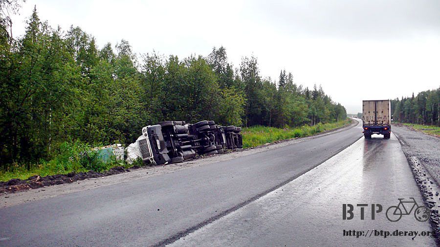 路旁是天雨路滑又愛開快車的翻車實錄,這台車應該翻不到幾個小時而已,滿滿的貨物灑了整個草地上都還沒有搶救。