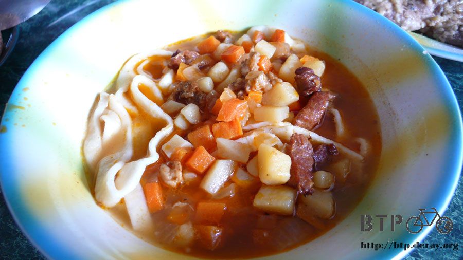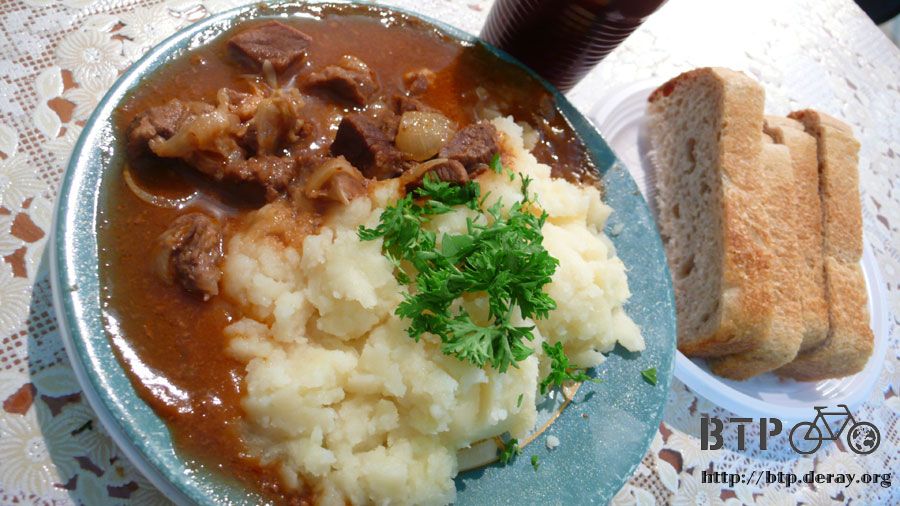 洗完澡後就可以吃早餐了,唯一供應的熱食就是這個很不像早餐的早餐,燉肉配馬鈴薯泥,一早就吃這個也未免太豐盛了些。