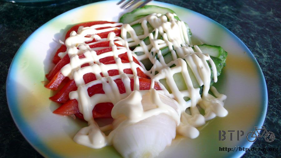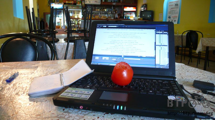 簡單地跟他們講了旅行計畫,現在已經騎了一半了,說明完我的來歷後,餐廳的媽媽送給我一顆番茄,蔬果很珍貴,趕緊吃掉補充營養。