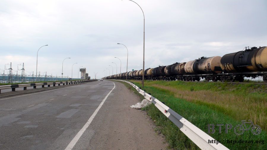 聯外的道路是一座很長的橋梁,底下是相當寬闊的大河,橋面因為施工變得不好走,旁邊就是鐵路,冒著黑煙的舊式火車頭拖運著應該是裝載油料的桶子。