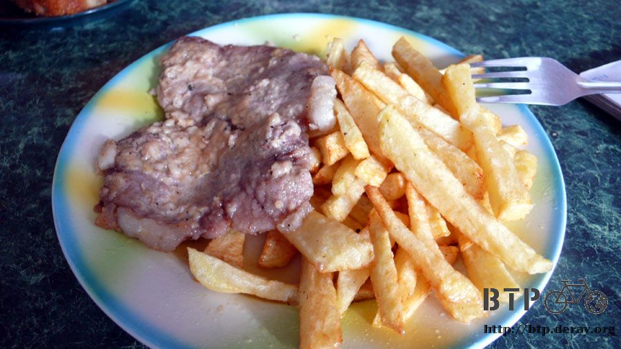 今天住旅館配上豪華大餐:有好吃的蔬菜沙拉配美乃滋、炸薯條、炸肉排、大碗公的蔬菜麵、以及每餐都會有的麵包和熱奶茶。