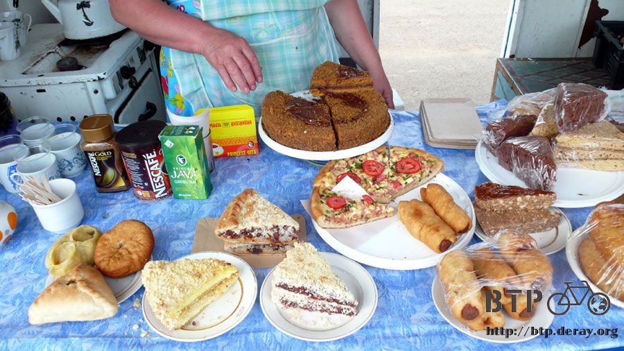 這間店不賣魚乾,賣很多手工製作的蛋糕、麵包、披薩,甜的鹹的都有,經過的時候店裡的媽媽就用俄文介紹了桌上的食物。