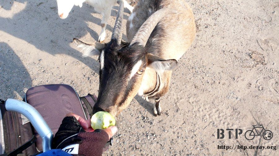 蘋果雖然沒有蟲,可是有些地方稍微爛掉,將剩下的果肉在山羊面前晃來晃去引誘牠們過來吃。