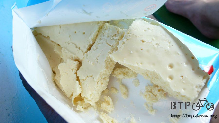 將鳳梨汁裝在水壺裡沿路可以慢慢喝,剩下三百CC配上硬麵包就是早餐,一早也來光顧商店的老伯伯看著我蹲在地上啃麵包,