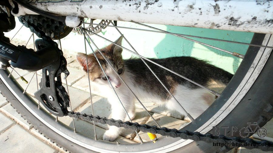 在餐廳整備小多時,旅館的一隻小貓不停地在小多身上嬉戲、在包包上跳上跳下、咬著鋼絲、拍打輪胎。