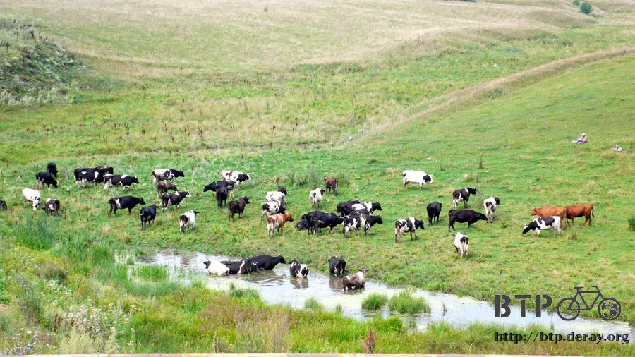 除了農地之外,放牧在俄羅斯也很常見,這邊有好多隻的牛在吃草,黑白相間的應該是乳牛。