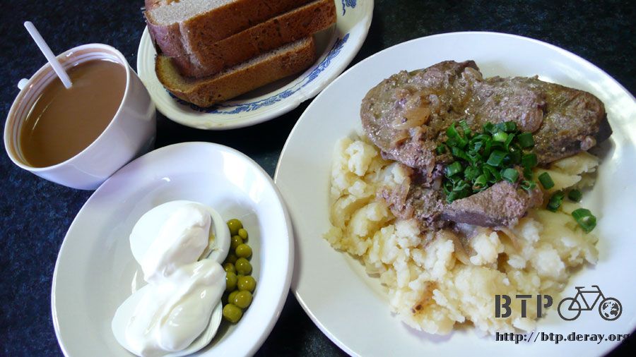 今天吃一大塊的肉、配上口感柔順的馬鈴薯泥、水煮蛋配上豌豆的沙拉、一大杯的咖啡和五條麵包,只收了六十八盧布,大概是其它餐廳的半價而已。