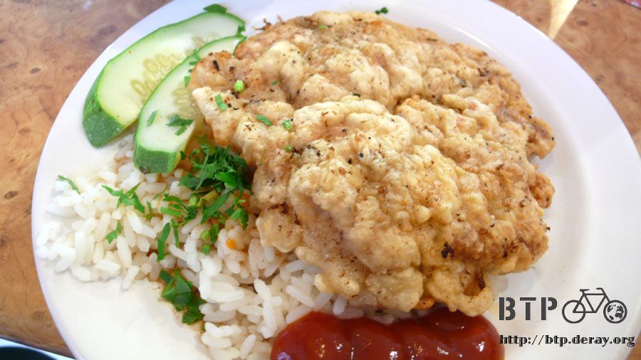 這一盤是排骨飯呀!!裹著麵衣、炸的酥香的排骨、配著淋上肉汁的白飯,番茄醬跟小黃瓜有點奇怪,但是不管它。