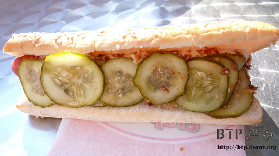 現在就先點包著培根的熱狗,夾在口感厚實的長方形麵包、切片的酸黃瓜、擠上美乃滋和番茄醬再灑一些酥酥脆脆的東西,完成!