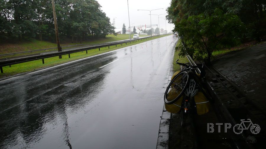 好不容易終於有個天橋可以稍微避一下,大雨一時半刻也沒有停的意思,將包包都套上防水袋準備冒雨前進。