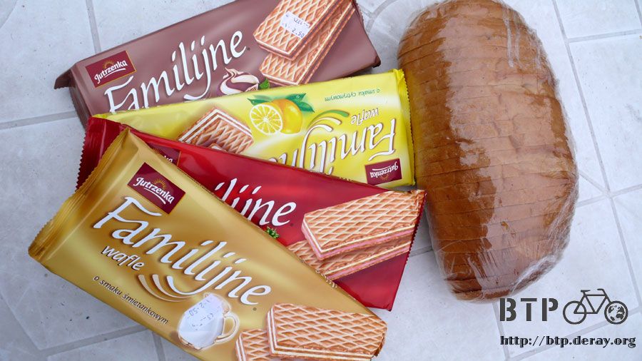 在這間郊區商店買了一條大麵包跟四包不同口味的夾心餅乾,麵包要吃光半條然後才准吃零食,先填飽肚子要緊。