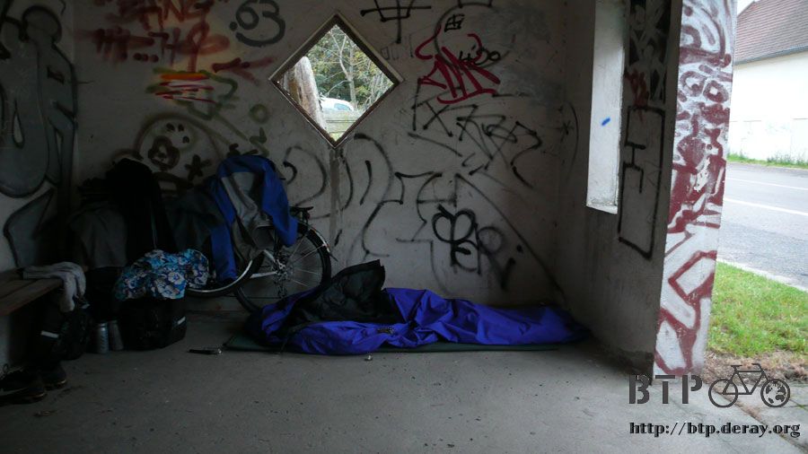 在這一間小套房大小的公車站睡了一夜,昨夜不敢再偷懶,將睡墊拿出來鋪底,果然好睡很多,睡醒後肢體不再僵硬。