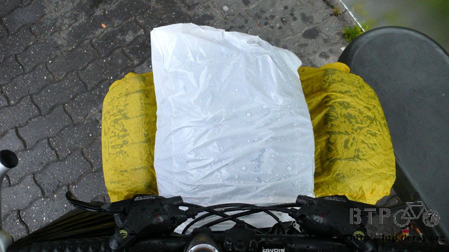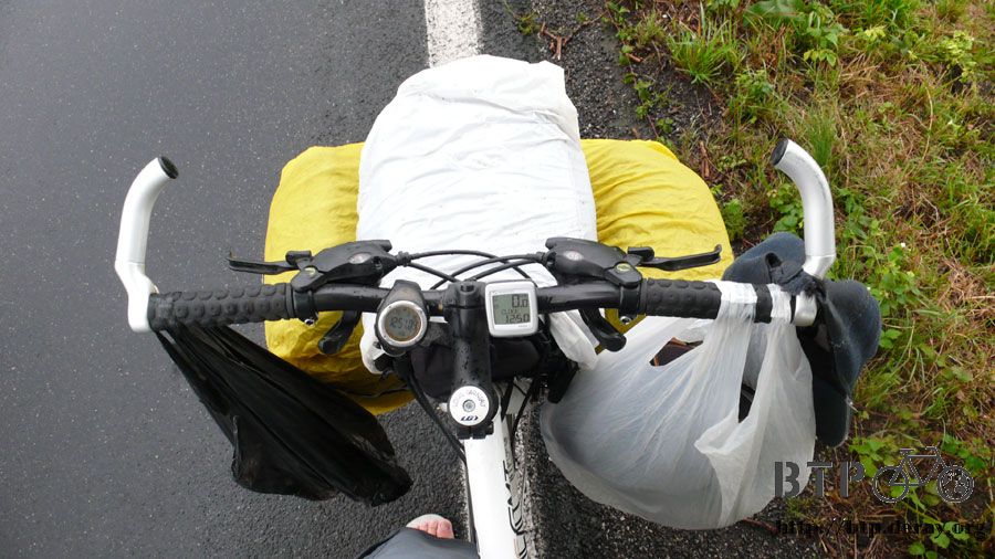 拿出最大的塑膠袋將包包給套起來,這樣一來全部的包包都有防水的保護了,除了綁在後座的睡袋、睡墊,還有淋雨騎車的我之外。
