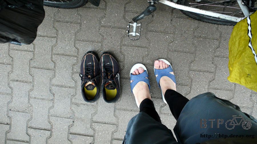 濕透的身體當然連鞋子跟襪子也一樣溼答答,無法再繼續穿著騎車,換上通風又透氣的拖鞋繼續上路。