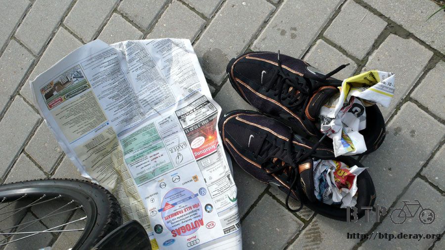 全部最濕的東西首推塑膠袋裡的兩隻鞋子,裝在袋子裡固然好攜帶,但是卻不通風,將身上拿出來的報紙塞進鞋子裡吸水氣。