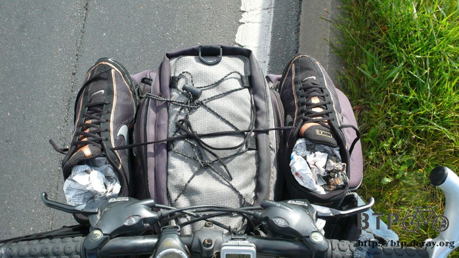 然後把鞋子的鞋帶綁在一起,放在最前面的包包上吹風,希望你們明天可以恢復乾燥。