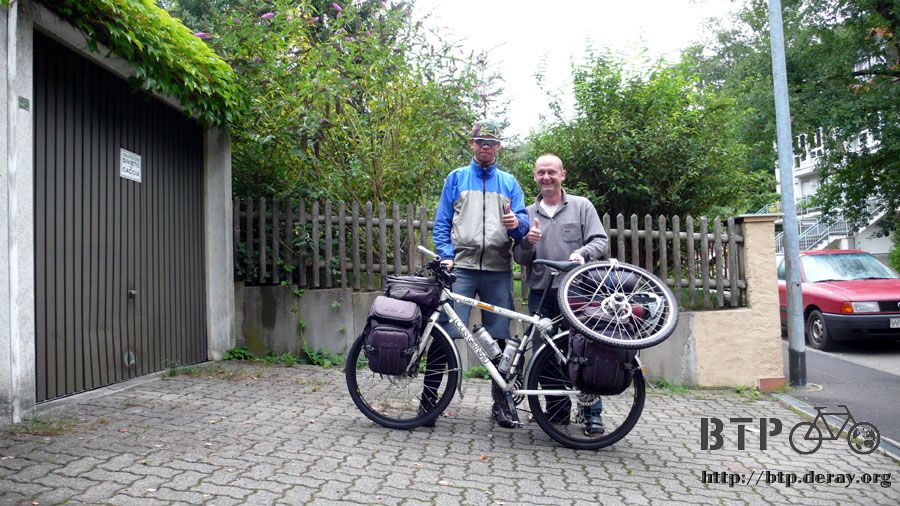 在樓下做暖身操,揮手跟去上班的Ulrike說掰掰,和Peter留下這張合影之後正式上路。