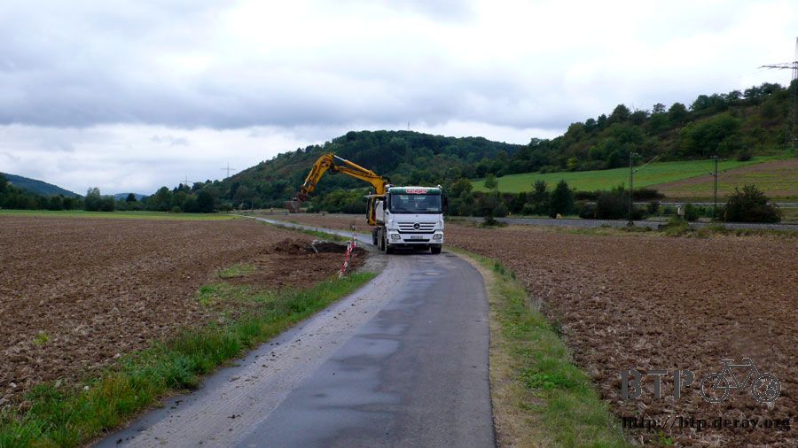 自行車專用道都不寬,一輛汽車剛好可以塞滿整條路,這輛卡車跟挖土機就堵住了我的去路。