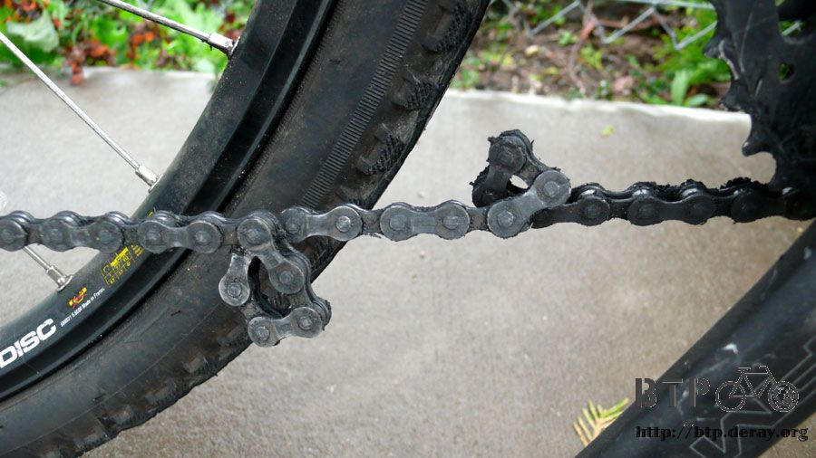 鏈條打結的緣故,結果有一小段彎曲掉,導致騎乘的時候,後變速會不斷的上下跳動,不論調到哪一個檔位都一樣。