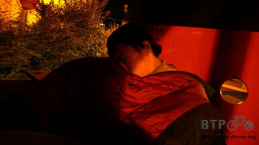沒有拿出帳棚跟睡墊,直接包著睡袋就在店門口的長椅上坐著睡了一夜。