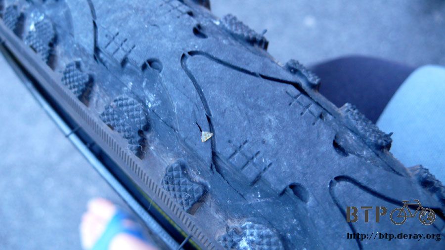 這次總算讓我找到讓輪胎洩氣的兇手,從內胎還是看不出破洞,但是從外胎則發現裂痕,拿著鑷子夾出一小片的玻璃渣。