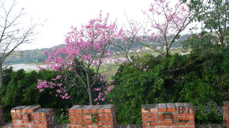 路旁種的花,顏色好漂亮,跟週遭的綠意相比,整顆樹全都是粉紅色的花瓣,挺有日本氣息。