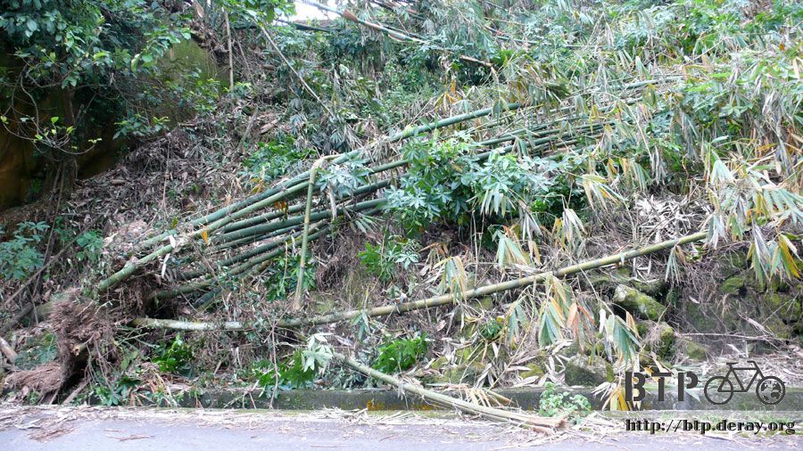 颱風剛走沒多久,山區的道路有很多落石和倒塌的樹木,一時半刻大概很難清理完畢,像這個竹子居然是橫著長...