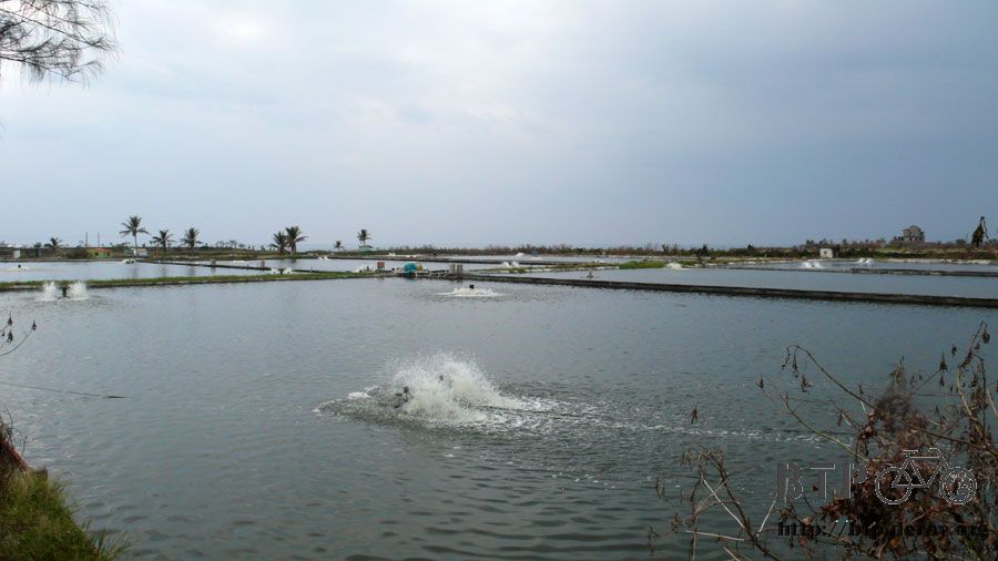 靠海的地方養殖的漁塭超級多的,完全取代了農田,這裡就是轉個不停的打氣馬達,裡頭養的不知道是什麼魚種。