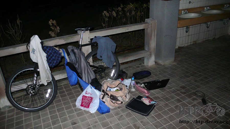 有水、有電而且也有屋頂,加上它雖然是廁所可是卻一點也不臭,今天就睡在廁所的外部走廊。