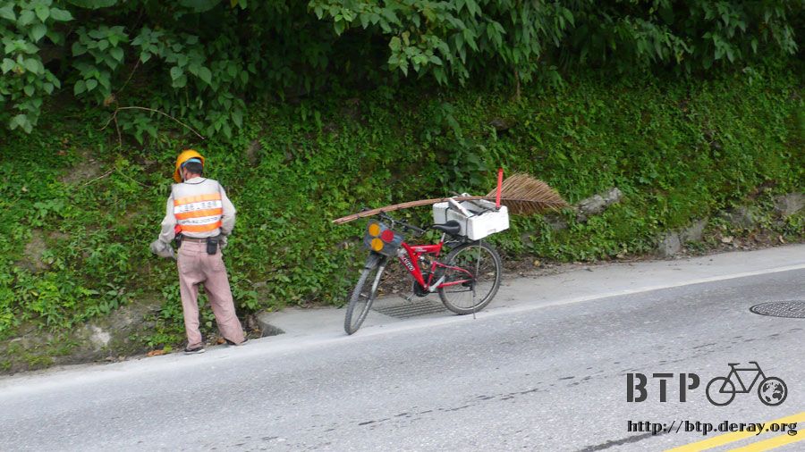 這個男人很猛,他應該是清潔員或是公務員一類的,騎腳踏車帶著一些簡單的工具整理蘇花沿路的落葉,集中在水溝裡焚燒。