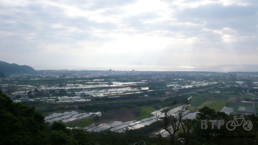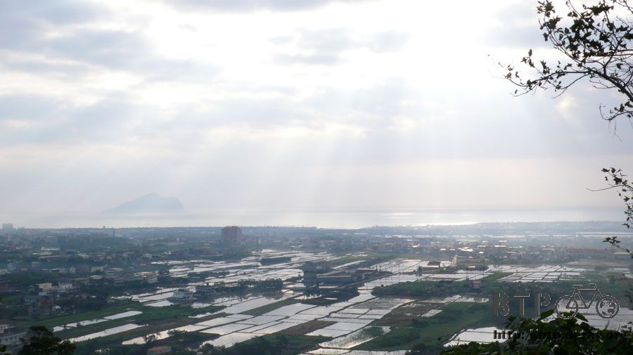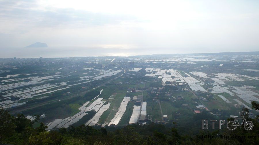 慢慢往上爬高之後,就可以鳥瞰蘭陽平原,海上那個影子就是龜山島,宜蘭直到今天還是有很多的水稻田,市區和鄉村並存得毫無衝突。