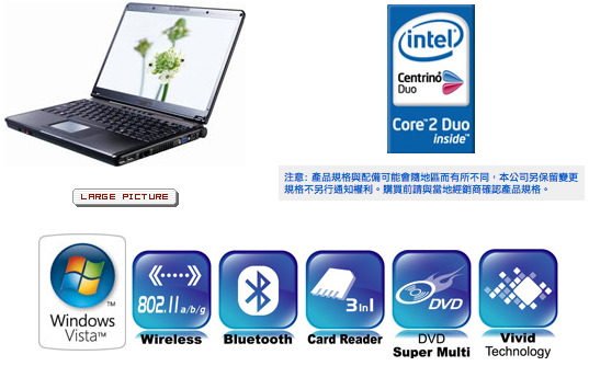 規格上大致是:Intel C2D、DDRII 1G、13.3" 鏡面LCD和Vista。