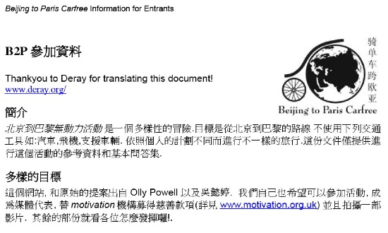 B2P的活動發起人之一,遠在紐西蘭的Olly架設了一個網站http://beijingtoparis.com/。