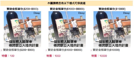 藉由諸位熱心人士贊助金額和物資,幫助我完成騎單車到處跑的夢想,