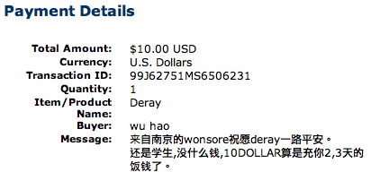 今日收到南京一位21歲學生吳皓(wonsore)透過Paypal贊助10美金。