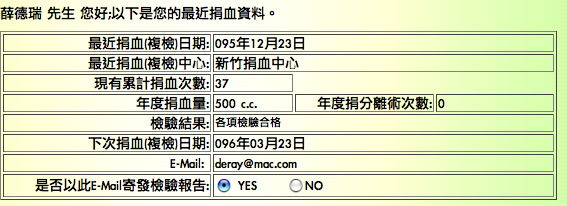 今天查了一下自己的捐血記錄,累積到目前為只一共捐了37次,每次500CC。